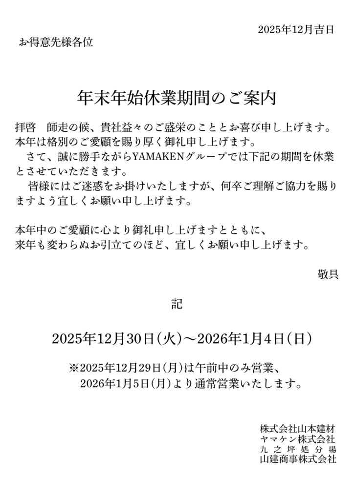 年末年始休業期間のご案内
