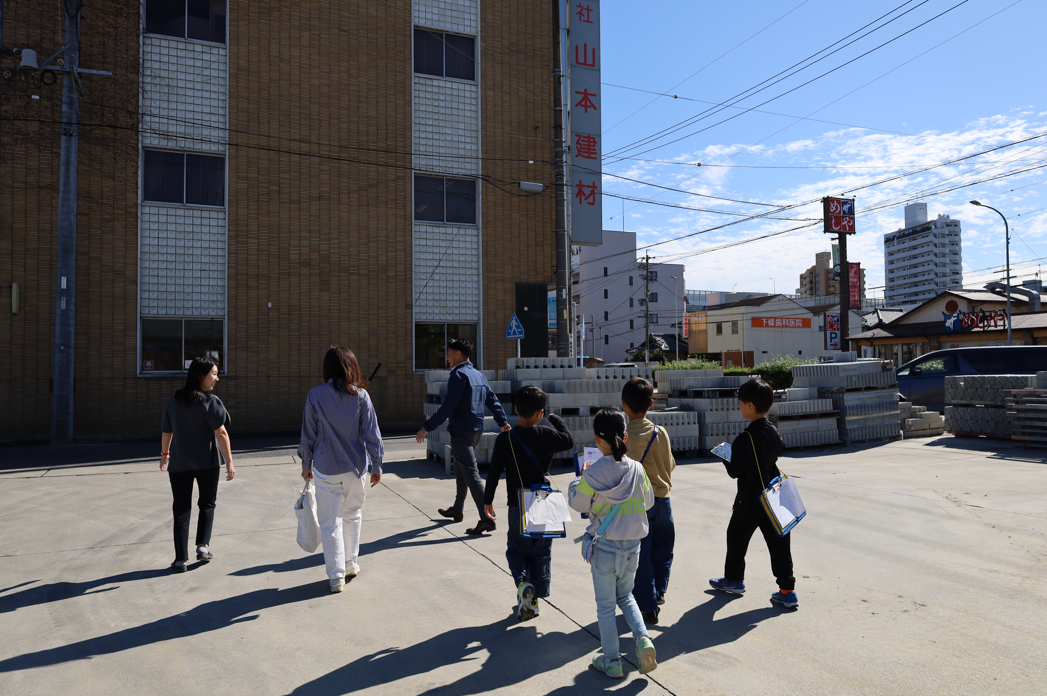令和7年10月23日(木)、地元小学校の2年生が「まち探検」のカリキュラムで弊社に来社しました。弊社社長より、創業の話やクイズを交えて建材商品の紹介をしました。